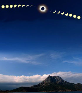 | 一次日全食的過程可以包括以下五個(gè)時(shí)期:初虧、食既、食甚、生光、復(fù)圓。初虧由于月亮自西向東繞地球運(yùn)轉(zhuǎn)間[詳細(xì)] |