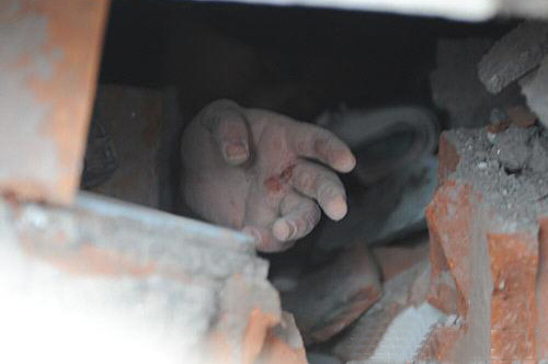 ——看到都江堰聚源鎮(zhèn)中學(xué)廣場(chǎng)擺放的遇難者遺體,總理心情沉重。