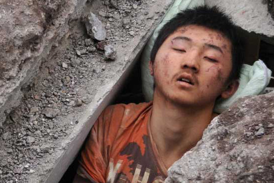 ——在都江堰,看見救援人員在廢墟里搶救一名被困小學(xué)生,總理蹲坐在廢墟上對(duì)著孩子說。